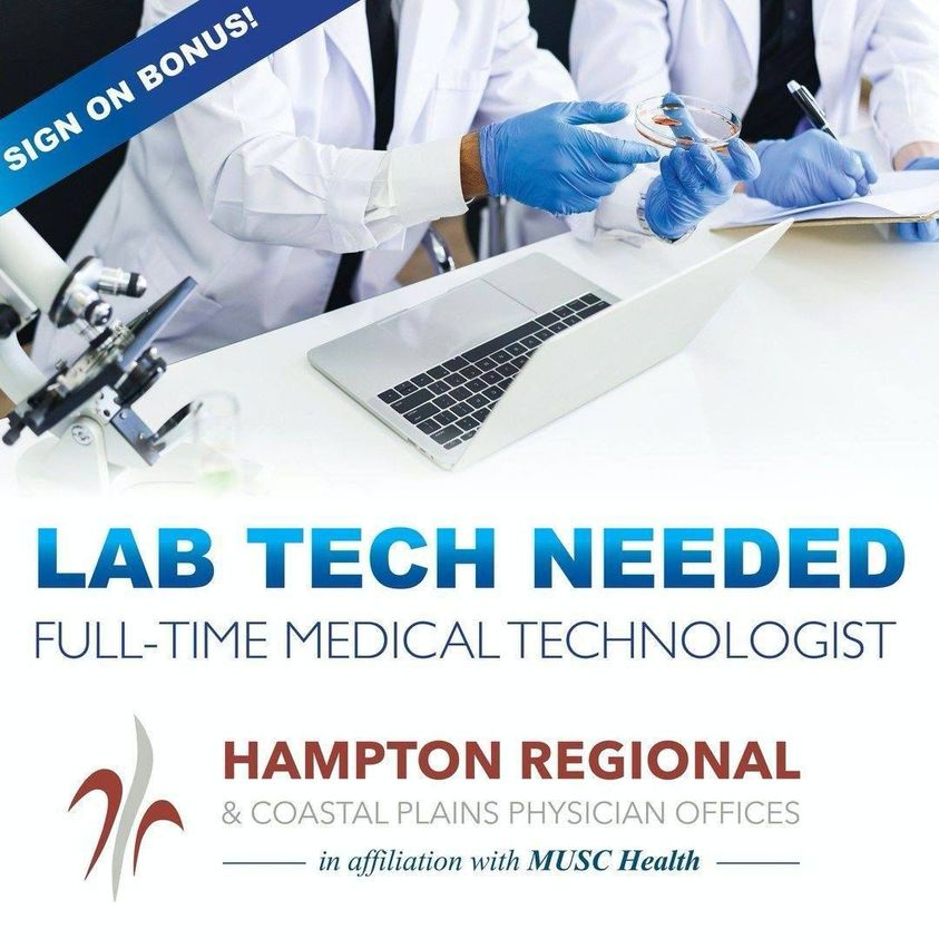 Hampton Regional Medical Center has an Immediate Opening for experienced Medical Technologists/Medical Laboratory Technologists who will enjoy working in a team environment. Excellent verbal & written communication skills needed. Computer competency will be necessary for this position. Salary based on experience. Sign On Bonus Available!MLT/MT Certification by ASCP or AMT required.